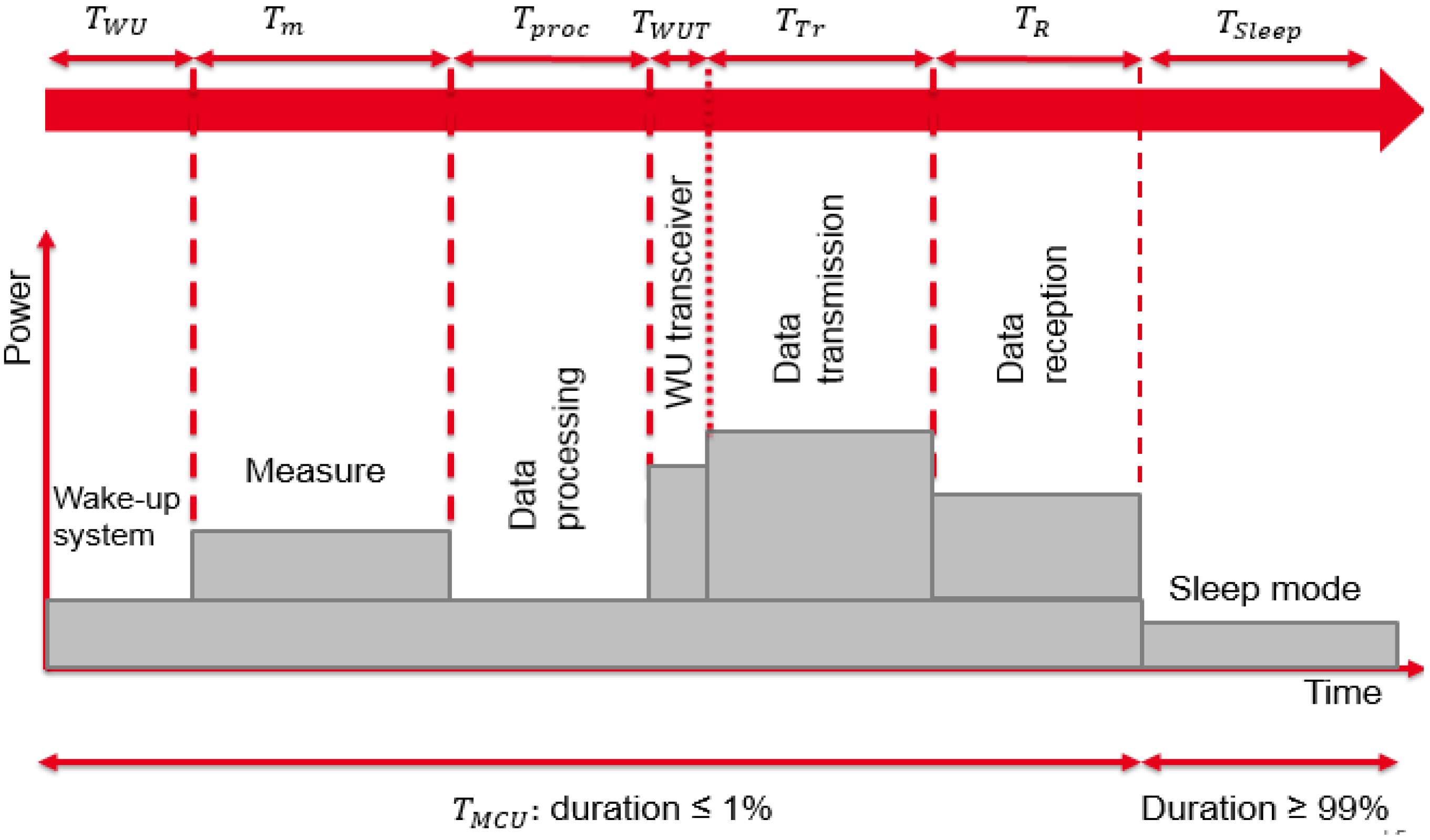 The following picture from https://doi.org/10.3390/s18072104 depicts a typical sensor working scenario, where a node alternates different activities each with a different power consumption