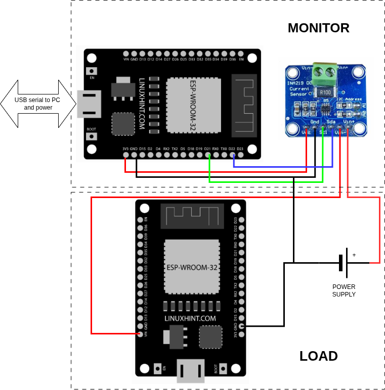 getShuntVoltage_mV()Voltage drop across the small $0.1 \Omega$ shunt resistor on the board. This is the raw data used to determine how much current is flowing (seegetCurrent_mA()).getBusVoltage_V()Voltage between the V- pin and Ground. This tells you the nominal supply voltage to the load; doesn’t include the small drop across the shunt resistor.getCurrent_mA()The chip takes the Shunt Voltage and divides it by the Shunt Resistance $I = \frac{V_{shunt}}{R_{shunt}}$getPower_mW()A simple multiplication of the bus voltage and the current. $P = V_{bus} \times I$loadvoltage = busvoltage + (shuntvoltage / 1000)This line calculates the total voltage at the source. Since there is a tiny drop across the sensor itself, the "true" source voltage is the voltage at the load plus what was lost across the shunt. Note that we divide shuntvoltage by 1000 to convert millivolts into volts so the units match.