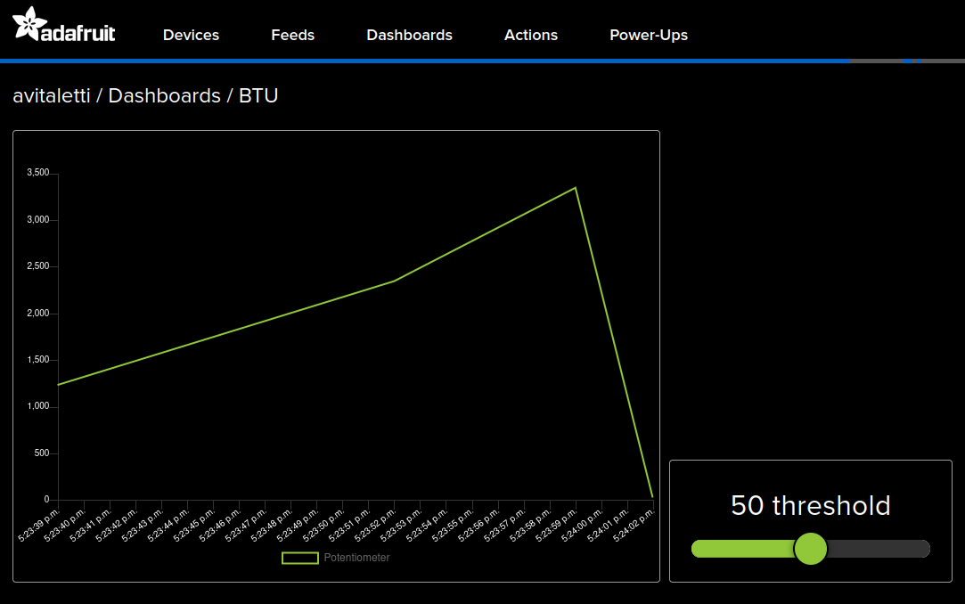 In other words when the device publishes on the avitaletti/feeds/potentiometer topic a new entry is created in the line chart, while when you move the slider the corresponding value is published on avitaletti/feeds/threshold