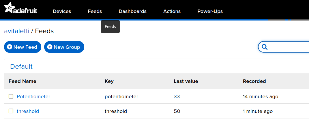 - Create an account on io.adafruit.com, in my case the username is avitaletti.