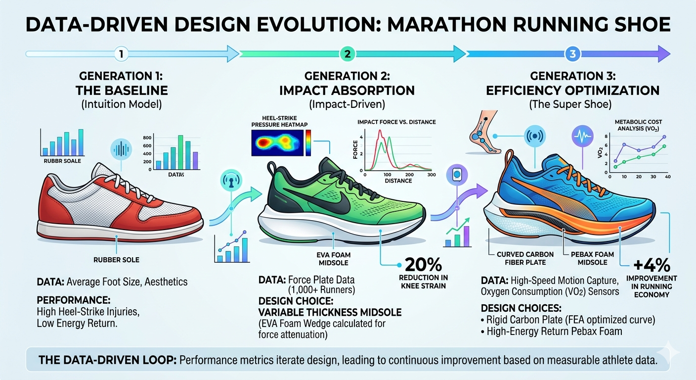 This journey, visualized below, moves from a simple starting point (intuition), through an impactful (but blunt) use of data, to the highly sophisticated engineering loop that drives a "Super Shoe."
